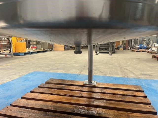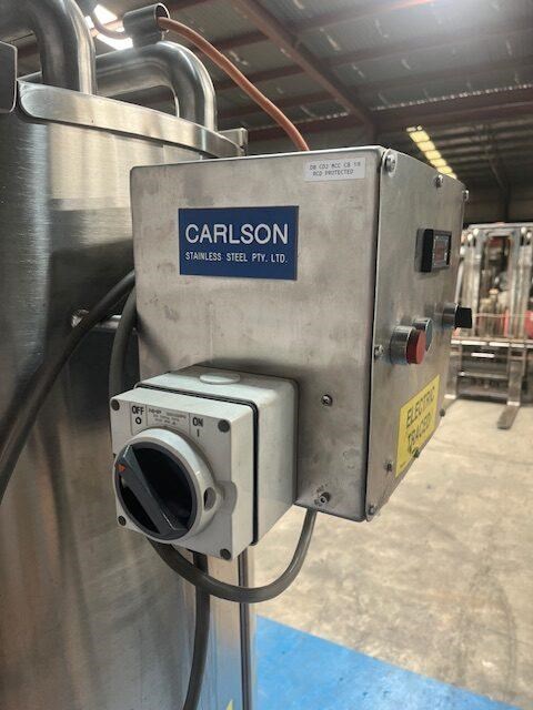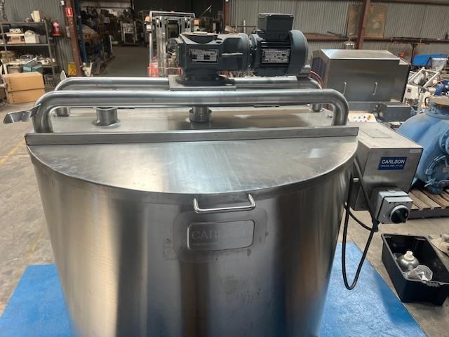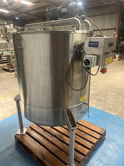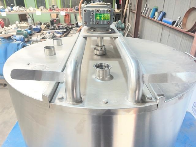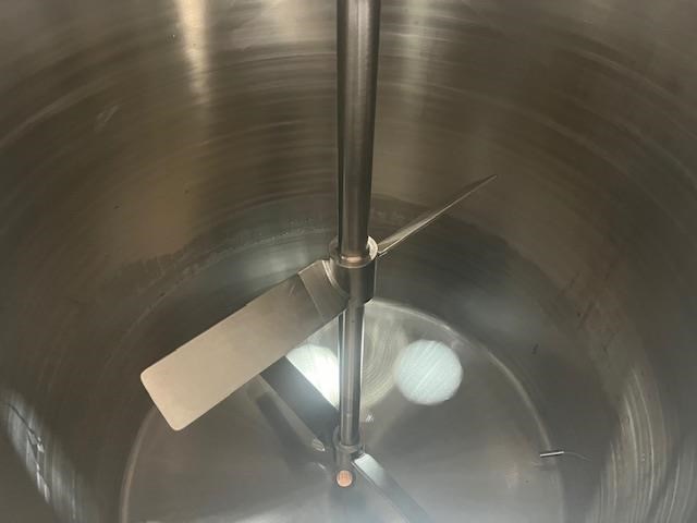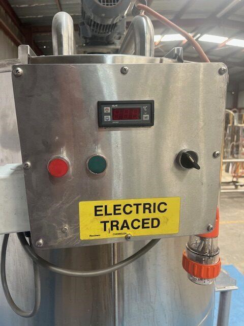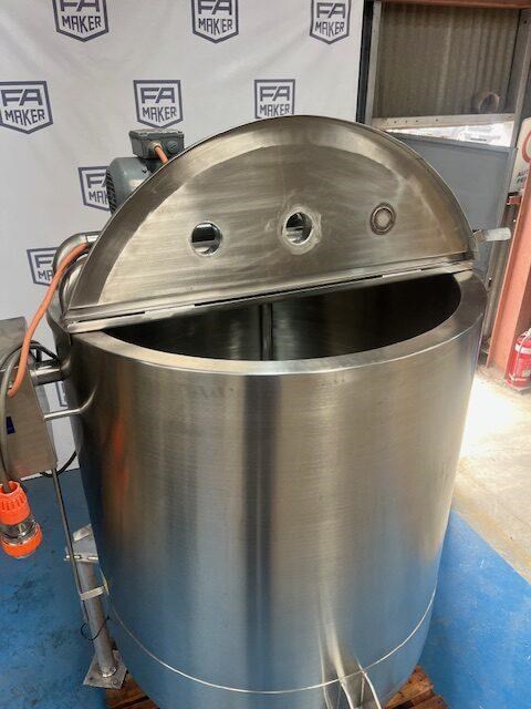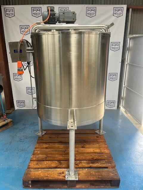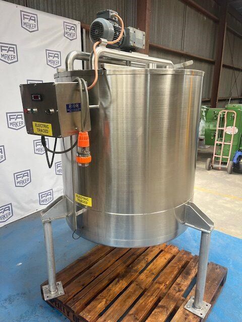 Stainless steel heating tank, complete with paddle type agitator. Capacity: 650 Litres 910mm dia x 1m vertical straight side Tank is electrically traced, with digital temp display, currently set to 50?C can go up to 90?C Agitator is a SEW 0.37 KW 46 rpm 415 volt 3 phase Half moon hinged lids at top with 2.5 inch inlets. Conical base to a 40mm outlet. Mounted on stainless steel legs. Last used for heating chocolate. Excellent condition.