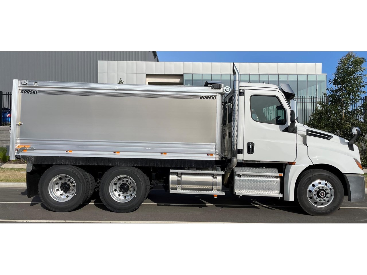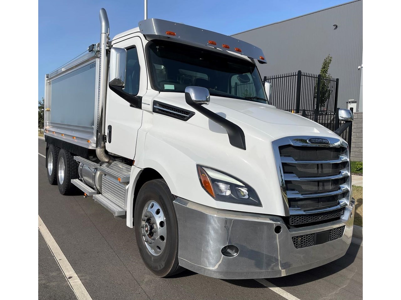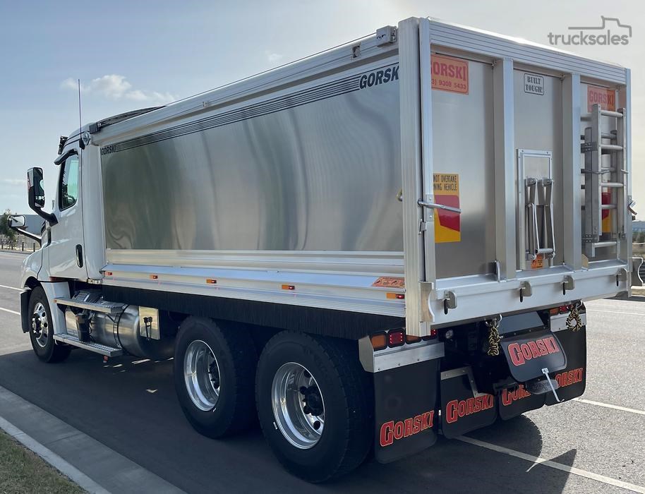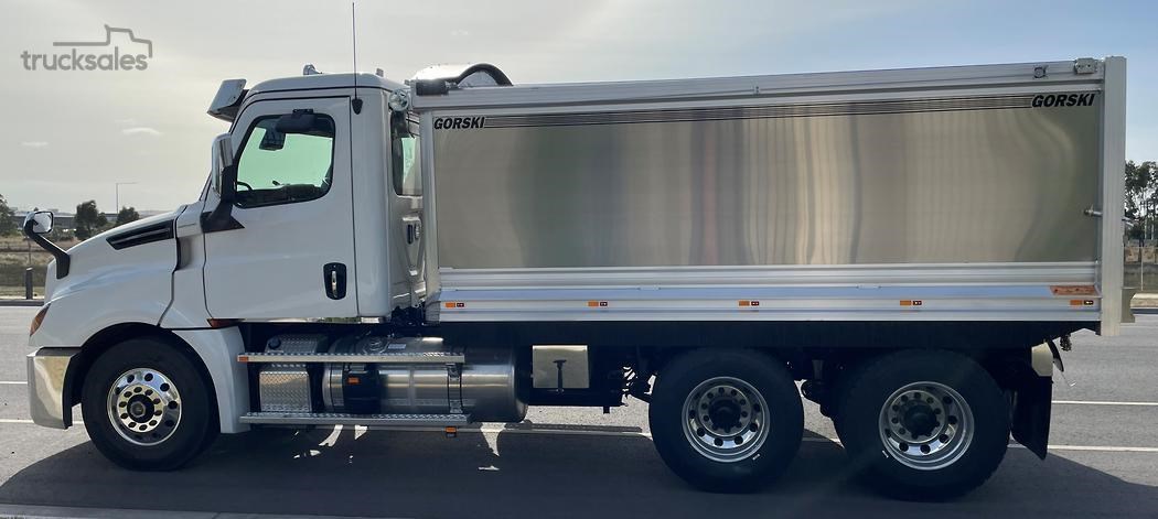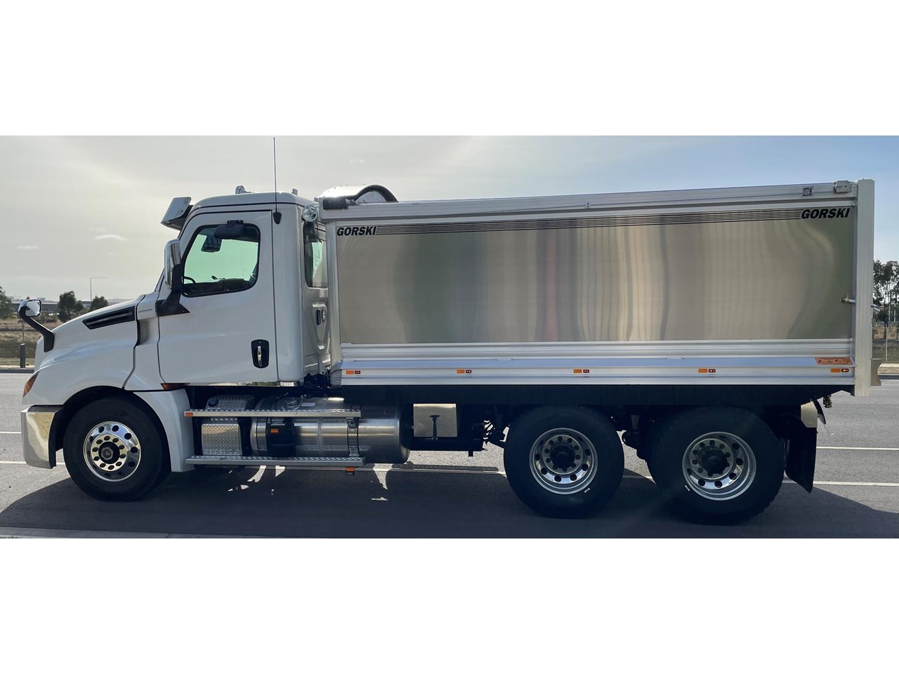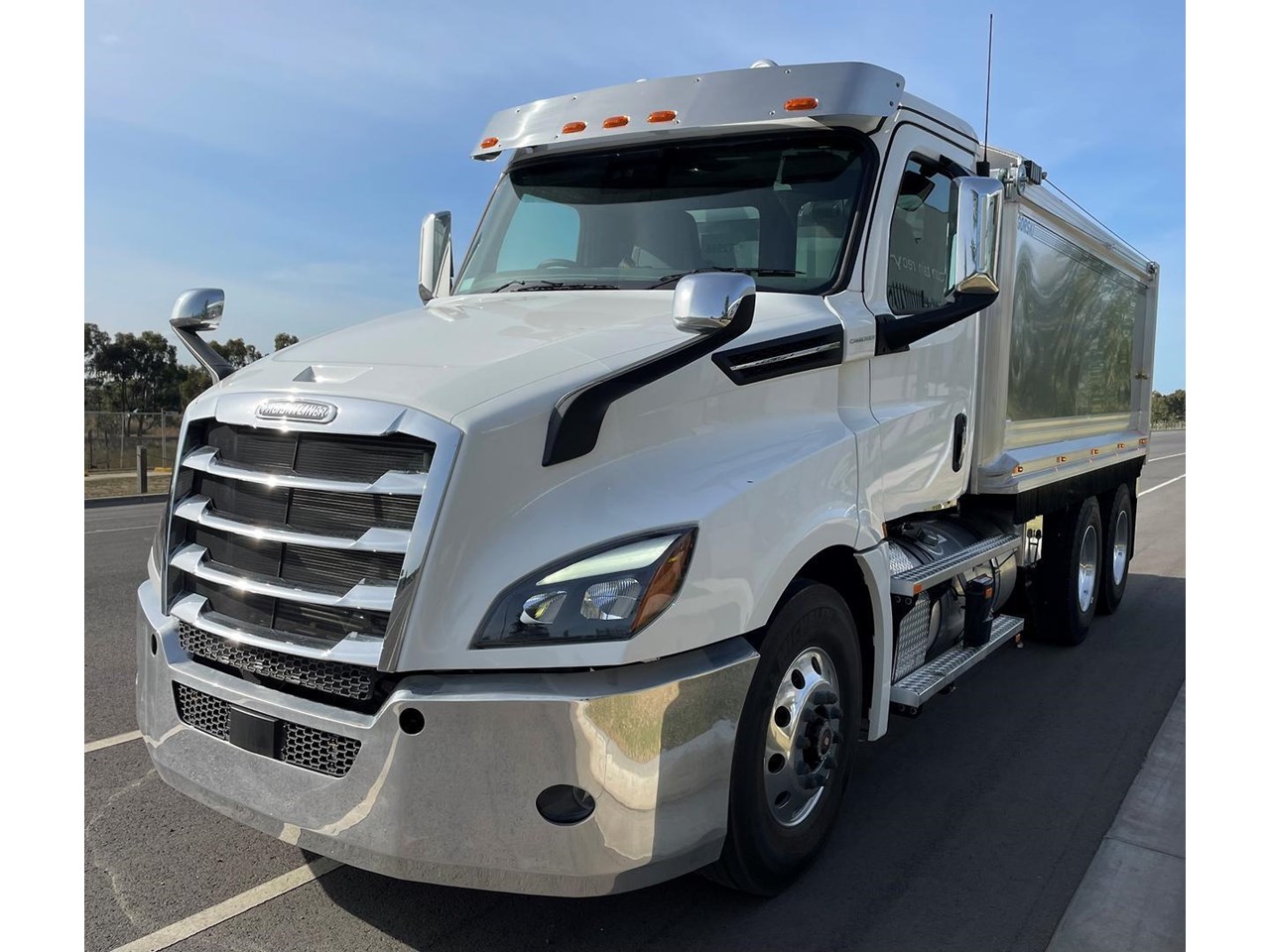 Cascadia 126 equipped with the latest safety technology Detroit Assurance 5.0 including Lane Assist, Side Guard Assist, Active Brake Assist, Adaptive Cruise Control, Auto Head Lamps & Freightliner Cascadia 126 with Gorski Engineering Alloy quarry spec tipper body with razor electric mesh tarp & rock sheets.