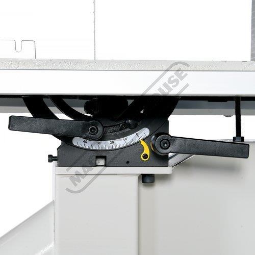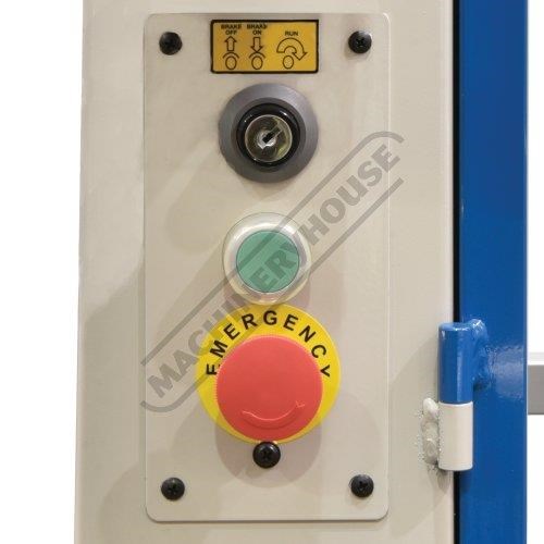Safety is paramount, with CE-compliant features including a 2-second blade stopping time, interlocked blade guard doors, a magnetic NVR power switch, an emergency stop switch, and a keyed motor brake release for safe blade changes.