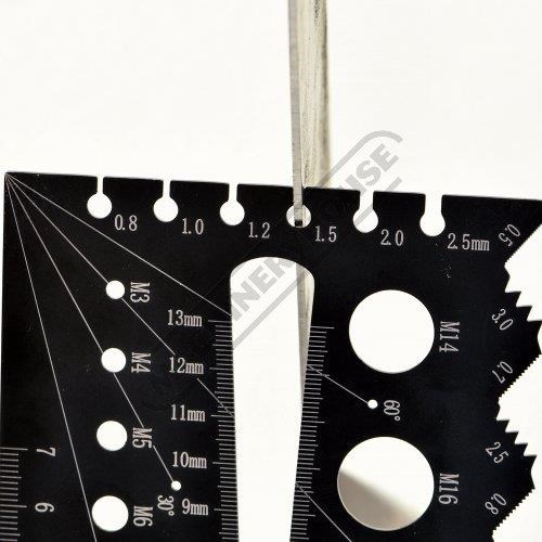 This multi gauge is the ideal tool as it can not only identify the size of bolts by checking the length/diameters/thread pitches but also can choose correct drills & determining taps before tapping. This gauge is also useful for checking thickness of washers or sheet metal, marking lines and measuring angles this multi gauge has an amazing wide variety of tasks it can be used to check. It also includes a hole gauge to be able to quickly & easily find the diameter of a hole up to 13mm.