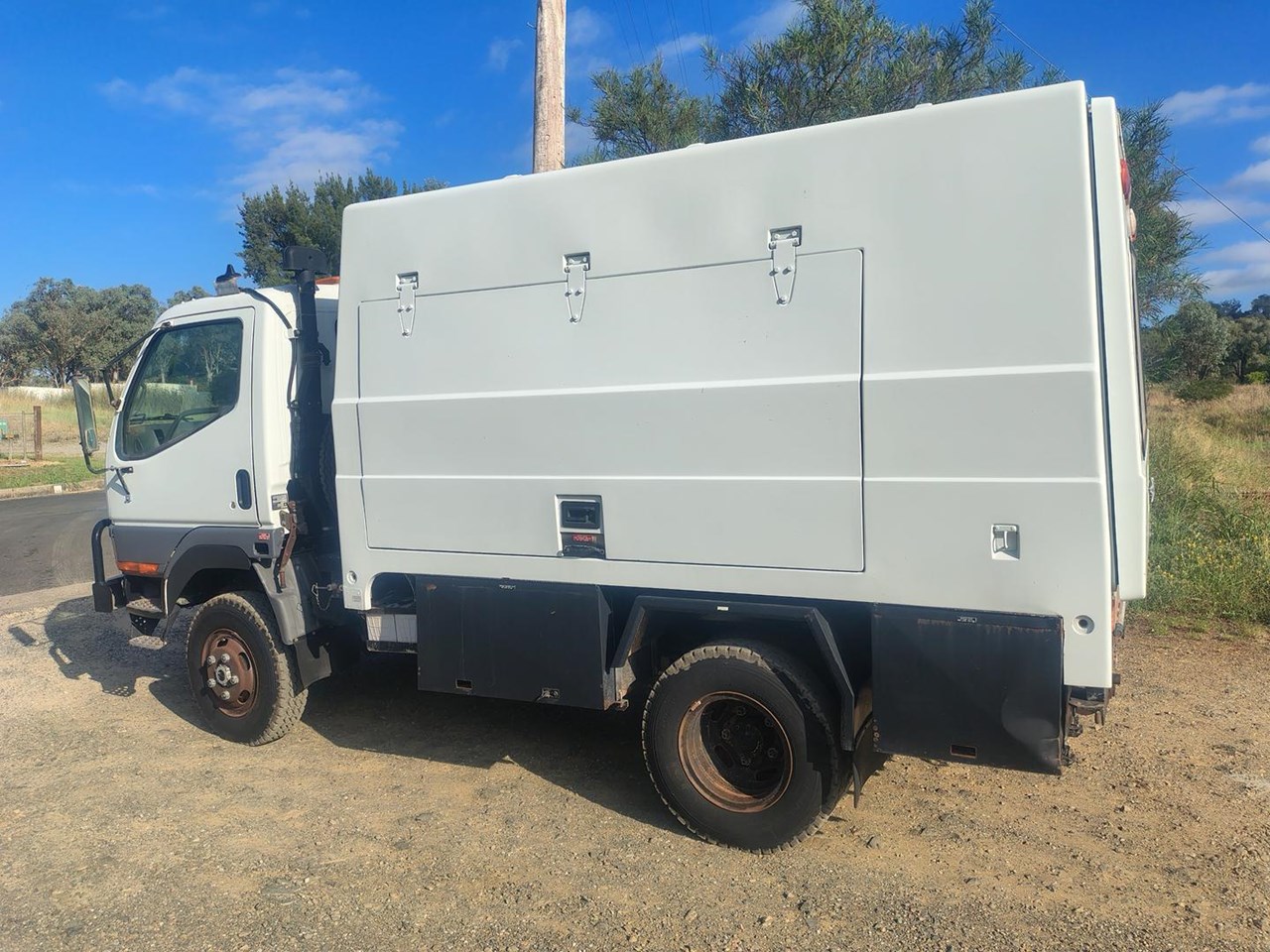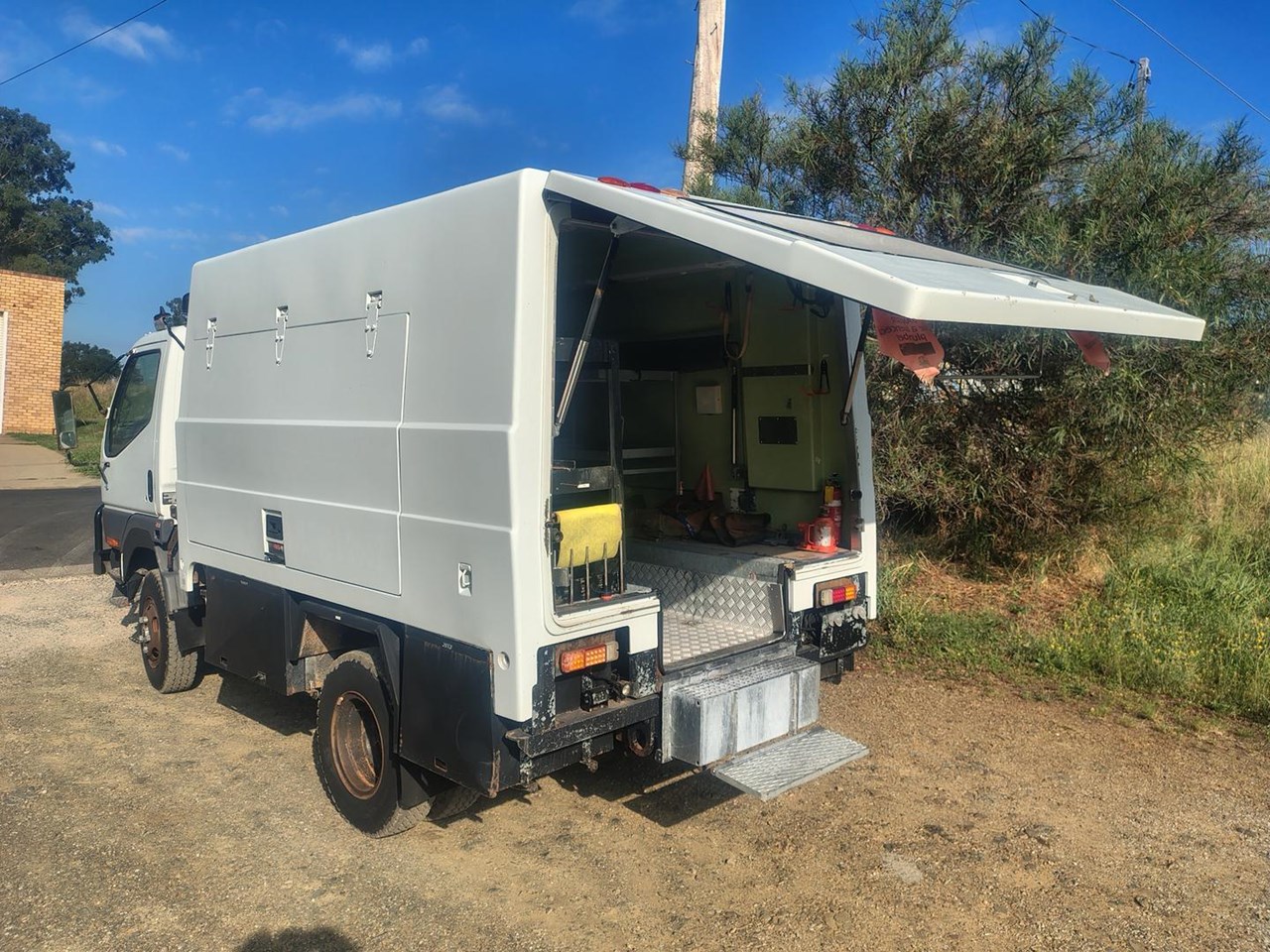 2000 Mitsubishi Canter 4x4 with Camper body, ex Defence, very well equipped with fibreglass camper body, 7.5t winch, 200L fuel tank, 50L water tank, built in compressor, solar panel with 12, 24 and 240 volt power, cab controled airbag suspension helpers, bull bar and tow bar.